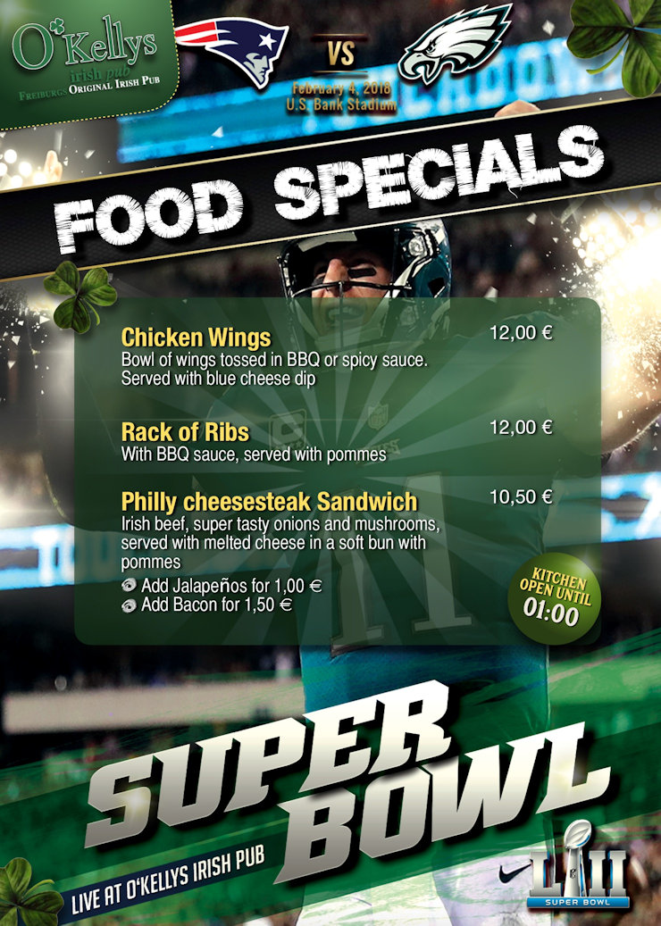 Amazing Super Bowl food deals all day until 01:00. Bar open til VERY late